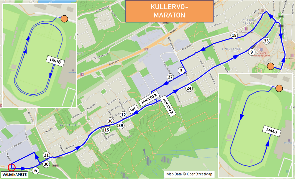 Maratonportista urheilukentälle, jota edetään n. 350m vastapäivää kiertämällä kohti maalia.