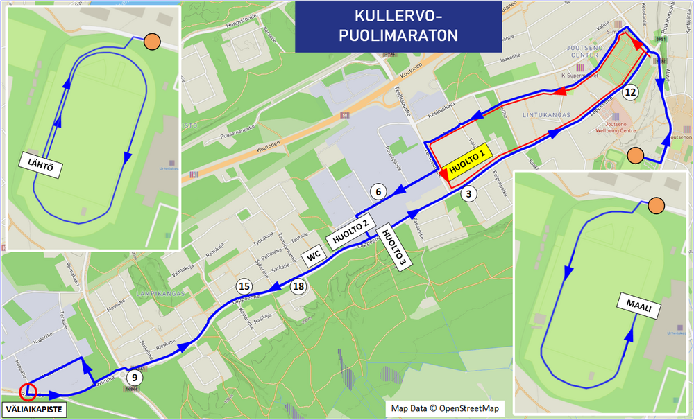 - 1x 3 km kierros (punainen viiva). Keltaisella merkitty huoltopiste on käytettävissä ainoastaan ensimmäisen kierroksen aikana.